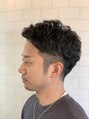 刈り上げをグラデーションにして、トップにパーマで動きをだしたアップバングスタイル。ONとOFFの切り替えで前髪を自由に変えることができるのもポイント!スーツ姿のビジネスマンにもオススメです!