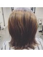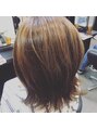 肩付近でハネてしまう方は外ハネスタイル。ハイライト・メッシュカラー入っています。ハンドブロー仕上げ。実際のお客様です。