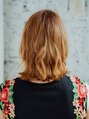 無造作なミディアムレングスのウェーブスタイルです。バングありの髪型でカラーリングは少し明るめのベージュなので少し柔らかいイメージに仕上げています。全体をミックスにコテで巻くかパーマをかけてあげると普段のセットが楽になります。
