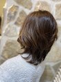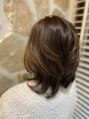 肩ラインのミディアムレイヤースタイル。トップをフワッと、襟足はスッと馴染みます。カラーは暗くならないよう、リタッチのみの白髪染めです。