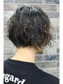 パーマを施した前下がりボブ。表面を軽くすることで、動きのあるスタイル。切り込むところを作ることで、メンズらしいボブの表現に。