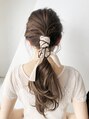ローポニーにベロアのリボンを巻き付け、顔周りの後れ毛を巻き、オイルでウェットに。【気に入ったスタイルは「ブックマークする」ボタンを押して、ご来店時ご提示ください】グラデーションカラー,小顔,マッシュ,ふわミディ,花嫁,耳かけ,厚めバング