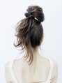 トップの高い位置でポニーを作り、ゆるくほぐし完成。【気に入ったスタイルは「ブックマークする」ボタンを押して、ご来店時ご提示ください】暖色系カラー,パープルカラー,艶カラー,ショートバング,春カラー,外人風カラー,ハイライトグラデーション