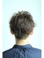 前髪を長めに残したショートレイヤーに毛先がハネるようなピンパーマをかけて無造作な動きをつけたスタイルです。トップは根元が立ち上がるようにボディパーマをかけ、毛先はピンパーマで外ハネになるように巻いています。