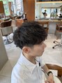 緩めにスパイラルパーマをかけています。緩めにする事で元々あるクセ毛に馴染むようになります。刈り上げのウェイトを高めに設定しているので今からの暑い時期にぴったりです、