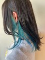 顔まわりを少しラフに短く切ってベースは長いボブのシンプルなカットですが、インナーカラーでアクセントをつけてます。シンプルなカットなのでセットは簡単楽ちんです青系のインナーカラーの場合は、2回ブリーチをおすすめします。