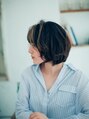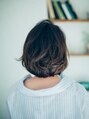 丸みのあるボブ。顔まわりはマッシュなラインを加えてやわらかさをプラス。重たすぎないようにトップにはハイレイヤーで動きをだしています。全体にふんわりするぐらいでパーマをかけているのでストレート毛の方でもやわらかな質感になります