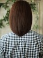 アゴ下ラインのグラデーションボブスタイルです。前髪もサイドの延長で長めにカットします。パートをどのラインでつけてもいいようにトップにフラットなレイヤーをいれます。カラーは落ち着きのあるブラウン系で。