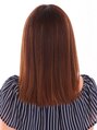 前髪長めのナチュラルなストレート。ライトオレンジベージュで透け感とツヤ感をプラスしてクールになりがちなストレートスタイルからチェンジ!!センターパートでセクシーさと清潔感のある仕上がりに。