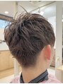 マッシュベースのショートレイヤーで束感を。サイド・ツーブロック、バック・ソフト刈り上げでスッキリと。カーキベージュで赤みを抑えた柔らかい仕上がりに。