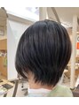 ショートボブベースの前下がりレイヤー。襟足をギリギリまでカットしてスッキリと。耳後ろを短くして耳掛けしやすく。縮毛矯正ストレートでツヤのあるまとまる髪に。部分的に毛量調整で軽く仕上げ、ドライヤーも時短に。