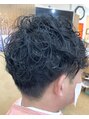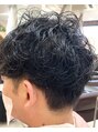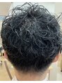 マッシュショートレイヤーのランダムパーマ。ハチ下はボリュームを抑えながらワンカールパーマ。トップはランダムな立体感のあるパーマ。サイドやバックはソフトに刈り上げ柔らかい仕上がりに。