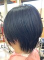 前下がりショートレイヤーボブ。生え癖が強いフェースラインや襟足部分のうねりをしっかり整え、トップやバックは手触りメインのふんわりストレート。ツヤツヤな質感に。