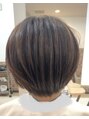 白髪をぼかすエイジングカラーで明るめの柔らかい質感へ。襟足スッキリと整えおさまりよく。毛量調整で時短ドライに。流しバングからのレイヤーで動きのある大人ショートボブに。