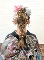 成人式/高めポニーテール/シニヨンアレンジ/パール/小花飾り