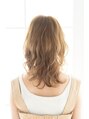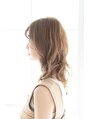 鎖骨下に切ったレイヤーボブ。トップは顎ラインにつなぐ前下がり。襟足が外にハネるように巻き、全体的に緩く揺れるパーマをかける。カラーは明るめのマロンベージュで透け感を。