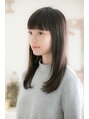 重めに作った前髪で目力を強調させるスタイル。顔周りを包み込むレイヤーはシャープですっきりとした印象に。カラーは暗めのソフトグレージュ。