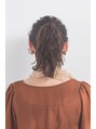 全体に波巻きにして、ミドルの高さにポニーテール。残った毛をねじりながらゴムを隠すように留める。ポイントとなる前髪は細めのコテで。