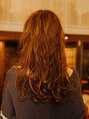 ブラウンのロングスタイル。 前髪があるスタイルなので重たさが出ないようにカラーはブラウン系にし、大人な印象に。 全体的に太めのコテで細かく巻いてあげることによって、ふわっと空気感が出て今はやりのデザインに。