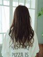 胸下のロングスタイル。毛先は軽めの質感で顔まわりや表面にレイヤーを入れています。とくに、顔まわりには細く細かい束が作れるようにレイヤーを入れているので胸下のロングスタイルでも重たく見えないように仕上げています。