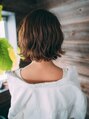顎ラインの切りっぱなしボブスタイルで、首が出てすっきりとしたスタイルに。表面にレイヤーを入れて重すぎない動きのある柔らかい印象になり、大人ボブスタイルに。カラーはナチュラルなブラウンにすることで柔らかい印象になります。
