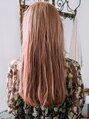 レイヤーなどは入れずに量感を調節して、切りっぱなし風にカットしています。量感を調節する事でロングヘアでも重く見えないようなヘアスタイルを作る事ができます。 カラーはほんのりピンクで色落ちする際に、綺麗になるように仕上げています。