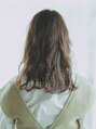 セミロングのパーマスタイルです。顔まわりにレイヤーと表面にもレイヤーを入れているのでIラインのシルエットに見えて、すっきり見えます。パーマは全体にゆるくかけて前髪も動きが出るようにかけています。カラーはアッシュベージュ。