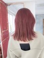 鎖骨あたりの切りっぱなしスタイル。表面にレイヤーを入れて動きをだし、前髪はシースルーバングで外に流れるようにカットすることによって大人っぽい雰囲気に。 カラーはピンクアッシュで、透明感を出してクール過ぎず甘すぎない雰囲気に。