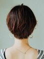 スッキリと首が見えるタイトなショートスタイルでバングは目の下くらいにカットして巻いておろしたりかきあげたりアレンジの出来る長さになっています。バングが今流行のうざバングなので襟足は少し重めの質感でバランスをとっています。