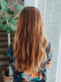 前髪はあえて少し重めにすることにより今時とは違う可愛さを演出しています。巻いた時に動きが出やすいよう毛先は軽めにし、全体的にレイヤーをいれています。 カラーはオレンジにし、巻いた時光加減で色が映えるようにしました。