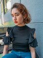 長さはアゴラインより少し長めのロブ スタイルで、パーマを活かしたヘアスタイルです。前髪もかきあげれるよう長めに設定しており、耳に掛ける事で、お顔周りはスッキリとし、うしろのパーマを引き立てています。