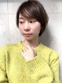 フラットめの少し前下がりのショートボブです。少し前下がりにする事で顔をシャープに見せる効果があります。耳掛けして2wayでお楽しみ頂ける飽きないスタイルになっています。