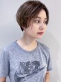 フラットめの少し前下がりのショートボブです。少し前下がりにする事で顔をシャープに見せる効果があります。耳掛けして2wayでお楽しみ頂ける飽きないスタイルになっています。