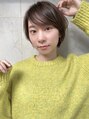 フラットめの少し前下がりのショートボブです。少し前下がりにする事で顔をシャープに見せる効果があります。耳掛けして2wayでお楽しみ頂ける飽きないスタイルになっています。