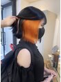 ブリーチ1~2回で可能なインナーオレンジ。オレンジ系のカラーは、馴染みやすいので、ブリーチの回数が少なくてもやりやすいカラーです。表面は赤みのないブラックにしています。
