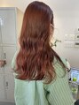 ブリーチなしのダブルカラーで作るアプリコットオレンジカラーです。元々明るい髪の方や、明るくなりやすい方は写真のようになりやすいですが、黒髪からだともう少し暗いイメージです。何回かブリーチなしのダブルカラーを続けると可能になります