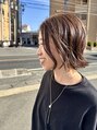 前下がりのレイヤーボブ外ハネスタイル。表面にレイヤーを入れスタイリングで内巻きにも外ハネにも◎カラーはプラチナブラウンで透明感を引き立てます。やりすぎない自然な抜け感やエアリーな質感が、どこか余裕のある女性ラフな可愛らしさを表現しています。