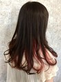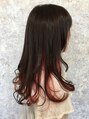 ピンクパープルのインナーカラーです。サイドからバックのインナー部分はブリーチ後にピンクパープルを塗布。トップはピンクブラウンでトーンダウンしてます。ピンク系は明るく見えてインナーも映えるスタイルです。