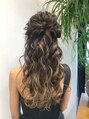 結婚式お呼ばれヘアアレンジ☆ワンショルダーのドレスに合わせてハイライトのロングヘアを活かしてハーフアップに。ヘアアクセサリーが無くても、華やかにヘアアレンジできます★ オーダーはお任せしていただければ、似合わせて提案させていただきます!
