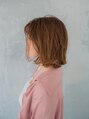 肩につくかつかないかくらいの重ためなカットラインのボブスタイル。春らしく、軽やかに見せるため、カラーリングは明るめで、透明感の出る薄いピンクベージュに。バングもシースルーで軽く。巻いてオン眉の長さで可愛らしく。[西葛西/西葛西北口]