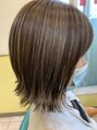 全体にハイライトカラーを入れ(白髪が伸びてきても目立ちにくいのでオススメ!)、上からラベンダーアッシュをオンカラーしました。赤みが消え、ラベンダーでツヤ感もUP!カットはあご下の切りっぱなしボブを外ハネにして可愛らしく仕上げました(^^)