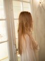ハイトーンカラーのくせ毛風ロング。ブリーチ後にミルクティーアッシュをオンカラー。色味をおさえた透明感のあるカラーに仕上げています。毛先はコテでゆる巻きにして外国人風な柔らかいくせ毛感を出しています。