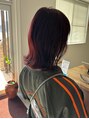 鮮やかなレッドバイオレットが目を引く、チェリーのように深みのあるカラーで仕上げ、ツヤ感が綺麗なスタイル。光に当たるとさらに綺麗な暖色系カラーと、切りっぱなしでお洒落なヘアスタイルに♪