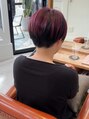 トップの丸みは残しつつ襟足をソフトに刈り上げたコンパクトショート★地毛の黒髪を活かして、表面のみブリーチし深みのあるボルドーのアンブレラカラーに♪髪の動きによってカラーデザインの束感が変化して、色抜けも楽しめる個性派お洒落ショートです◎