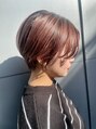 大人かわいい前下がりのショートボブはシャープに切ったライン、襟足をしめてスッキリ見せたりと、メリハリを効かせて絶妙なバランスに!カラーはブリーチ後くすみ感のあるピンク、レッド系ベージュでつや感、質感をプラスして大人見えに!