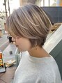 大人かわいい前下りショート、大人ショートボブはシャープに切ったライン、襟足をしめてスッキリ見せたり毛先の質感、メリハリを効かせて絶妙なバランスに!ボブ、ショートもハイライトで束感、質感をプラスしてくすみカラーのヌーディベージュをオンカラー!