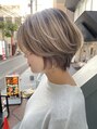 大人かわいい前下りショート、大人ショートボブはシャープに切ったライン、襟足をしめてスッキリ見せたり毛先の質感、メリハリを効かせて絶妙なバランスに!ボブ、ショートもハイライトで束感、質感をプラスしてくすみカラーのヌーディベージュをオンカラー!