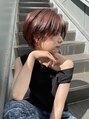 大人かわいい前下りショート、束感ショートはシースルーバング、シャープに切ったライン、襟足をしめてスッキリ見せたり、毛先の質感と、メリハリを効かせ絶妙なバランスに!カラーは赤みの強いダスティーピンクでつや感、束感をプラスしヘルシースタイルに!