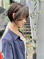 大人かわいい前下がりショートボブはシャープに切ったライン、襟足をしめてスッキリ見せたりと、メリハリを効かせて絶妙なバランスに!カラーはくすみ感、透明感のあるスモーキーグレージュで、質感をプラスして前髪なしショートはウェットスタイルに!