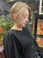 大人かわいい前下りの前髪なしショート、大人ショートボブは 似合わせカットでシャープに切った毛先のライン、襟足をしめスッキリ見せたり、メリハリを効かせ絶妙なバランス!ブリーチ後パールミルクティーで大人見えに。ヘルシースタイル楽しみませんか?